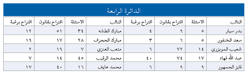أما الدائرة الرابعة فإن النائب بدر سيار وجه خمسة أسئلة وتسعة اقتراحات بقوانين وأربعة اقتراحات برغبة، ووجه النائب سعد الخنفور خمسة أسئلة وستة اقتراحات بقوانين وثلاثة اقتراحات برغبة، وتقدم النائب شعيب المويزري بـ 14 سؤالا و72 اقتراحا بقوانين وستة اقتراحات برغبة، ووجّه النائب عبد الله فهاد 17 سؤالا و74 اقتراحا بقوانين و40 اقتراحا برغبة، ووجه النائب فايز الجمهور تسعة أسئلة وتسعة اقتراحات بقوانين وستة اقتراحات برغبة، ووجّه النائب مبارك الطشه 34 سؤالا و51 اقتراحا بقوانين و12 اقتراحا برغبة، وتقدم النائب مبارك الحجرف بـ 28 سؤالا و17 اقتراحا بقوانين و19 اقتراحا برغبة، ووجه النائب متعب العنزي 7 أسئلة و19 اقتراحا بقوانين واقتراحين برغبة، ووجه النائب محمد الرقيب 45 سؤالا و14 اقتراحا بقوانين و7 اقتراحات برغبة، ووجه النائب محمد هايف 16 سؤالا و40 اقتراحا بقوانين و17 اقتراحا برغبة. وتشير الارقام الى تصدر النائب عبد الله فهاد باجمالي 131 سؤالا واقتراحا، يليه مبارك الطشه في المركز الثاني بـ97، ومن ثم شعيب المويزري بـ92، ويليه محمد هايف بـ73 و من ثم محمد الرقيب بـ66 نشاطا، وتاليا مبارك الحجرف بـ64، ومتعب الرثعان بـ28، يليه فايز الجمهور بـ24 سؤالا واقتراحا، وجاء بدر سيار في المركز قبل الاخير بـ18 سؤالا واقتراحا وفي المركز الاخير جاء سعد الخنفور بـ14 نشاطا.