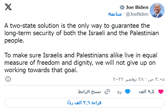 وأضاف بايدن عبر منصة «إكس» أن الولايات المتحدة لن تتوقف عن العمل من أجل تحقيق حل الدولتين «لضمان تمتع الفلسطينيين والإسرائيليين بالحرية والكرامة على حد سواء».