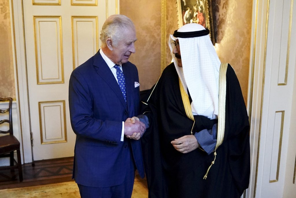 King Charles III (left) receives the Crown Prince of Kuwait Sheikh Mishal al-Ahmad al-Jaber al-Sabah during an audience in Buckingham Palace, London. Picture date: Wednesday October 25, 2023. PA Photo. Photo credit should read: Jordan Pettitt/PA Wire