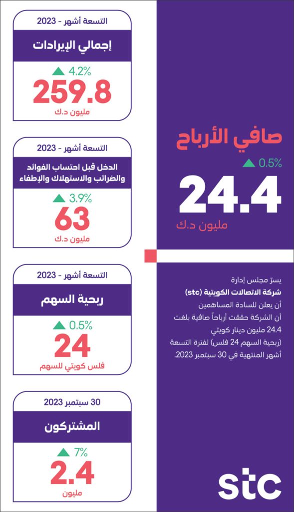 أعلنت شركة الاتصالات الكويتية "stc" الرائدة في تمكين التحول الرقمي وتقديم خدمات ومنصات مبتكرة للعملاء في الكويت، عن نتائجها لفترة التسعة أشهر المنتهية في 30 سبتمبر 2023، مسلطة الضوء على أهم الإنجازات وعلى الأداء المالي والتشغيلي والمساهمات المجتمعية التي قامت بها الشركة خلال التسعة أشهر الأولى من العام 2023.